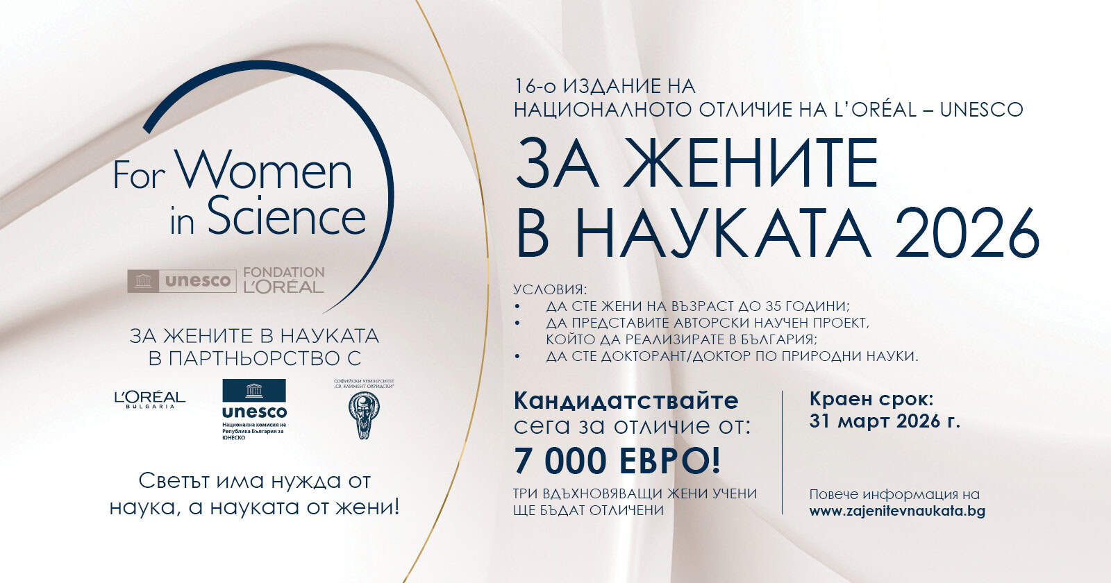 Започна кандидатстването за шестнадесетото издание на Националната програма „За жените в науката“ на L’Oréal и ЮНЕСКО. Срокът за участие е до 31 март 2026 г. Програмата е насочена към български млади жени учени в областта на природните науки, като ги …